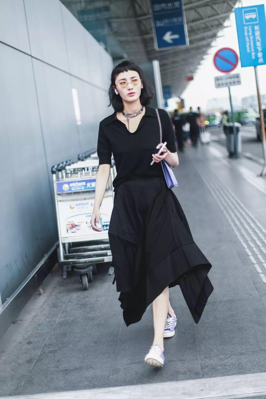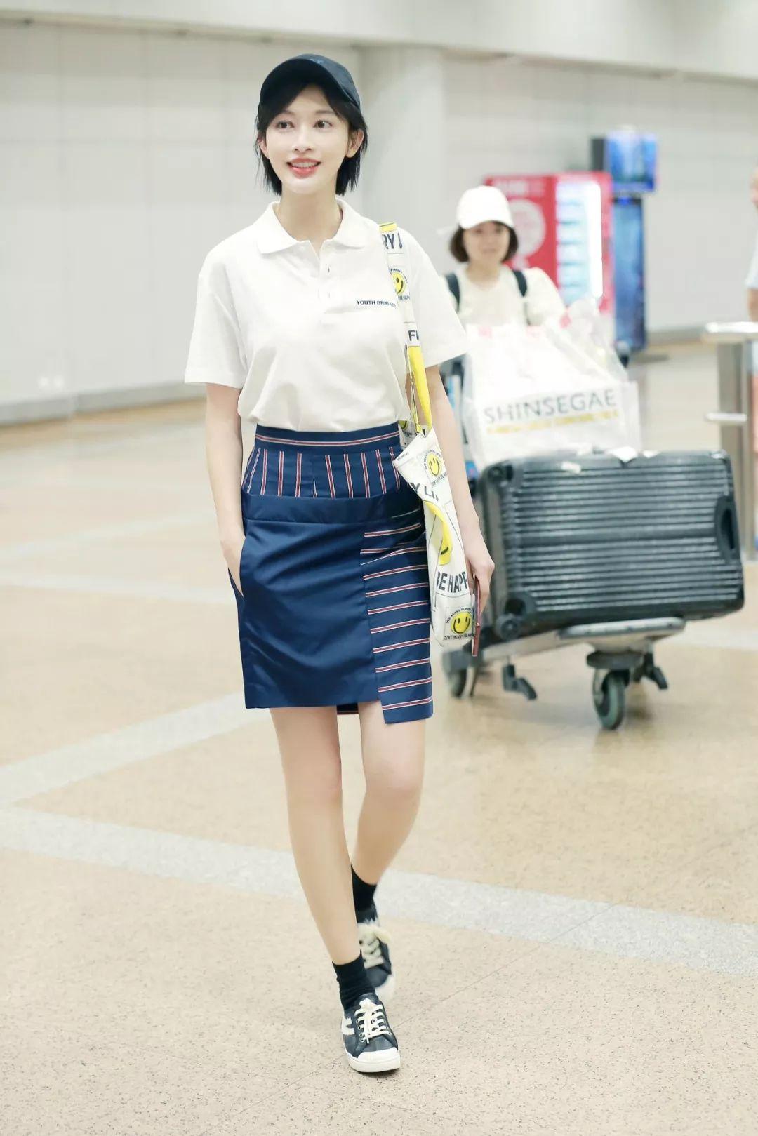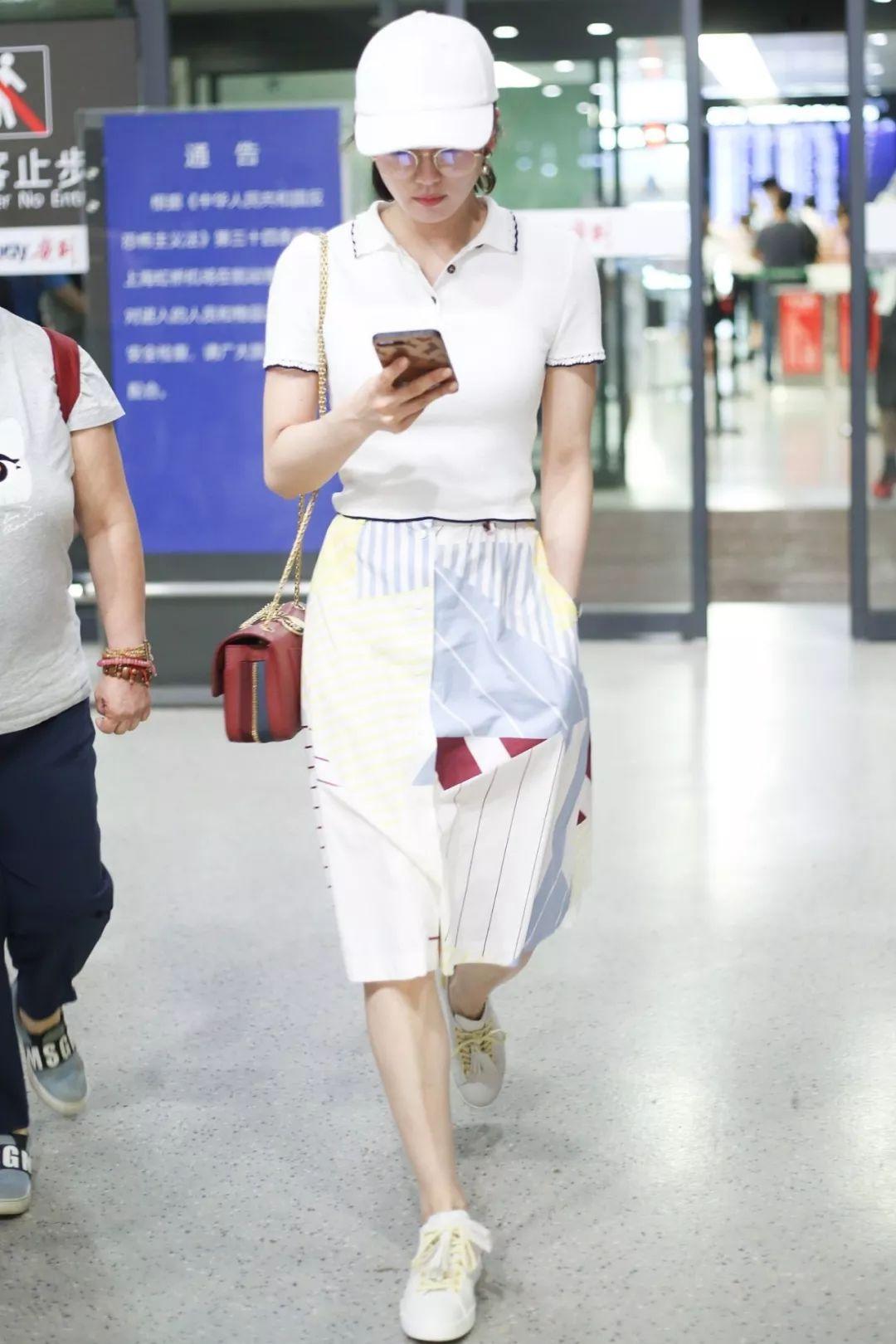 Zhang Li recently chose this CP combination for her airport look. Pairing a suit fabric skirt with a pure white Polo shirt can enhance the overall texture. Paired with a baseball cap and casual shoes, it looks very age-reducing and makes you look like a sweet girl next door.