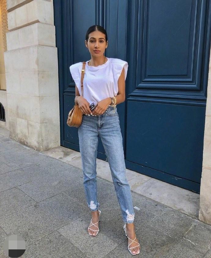Sleeveless T-tops are also a very popular trendy item. You can choose butterfly sleeves like the picture above, or you can remove the excess part, which is suitable for A girl with a moderate frame and a relatively tall figure will look very energetic. It is best to have a bit of laser fluorescence, so that it is not easy to match the clothes.