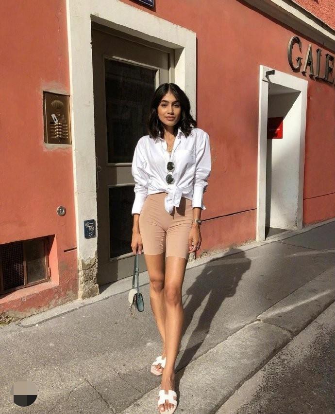 Cycling pants have always been a favorite among fashionistas. There has been no downward trend since they became popular. White/black/beige are three common and versatile styles. If you are confident about your figure, or your legs The lines are very smooth, and you can boldly show off your confidence. Simply put on a white shirt and pin the sunglasses on the collar, making you feel comfortable and sexy, lively and charming.