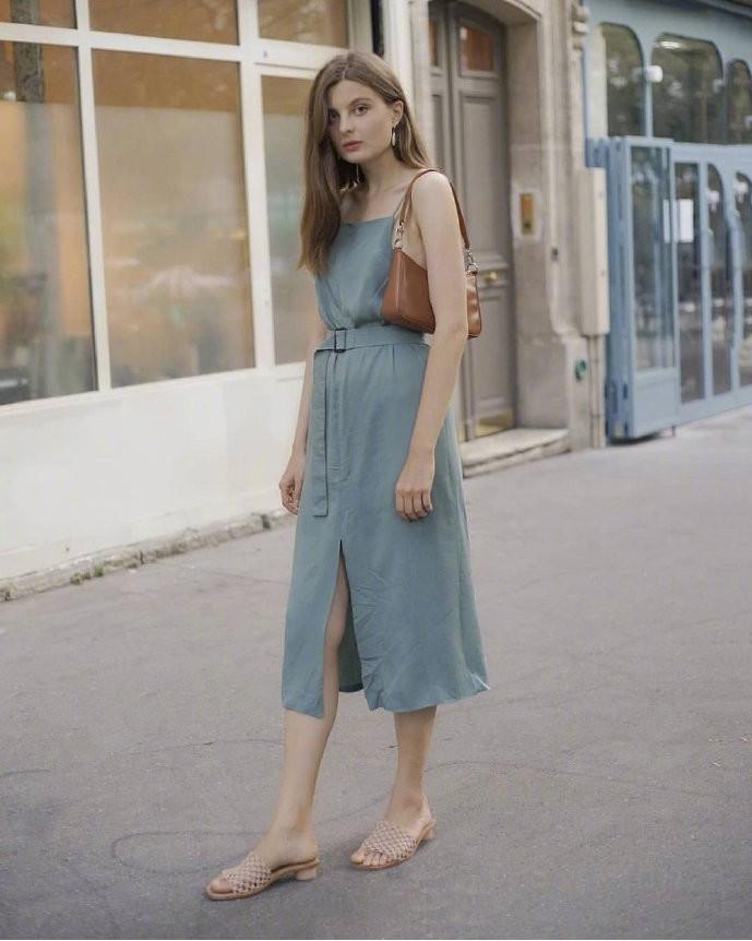 A small suspender skirt, with a belt that embellishes a slender figure, a slight slit at the hem, revealing slender calves from the side, and an underarm bag on one shoulder, showing the power of simple fashion.
