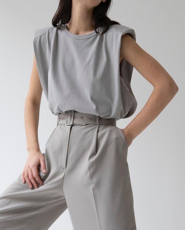 ①Gray sleeveless T-shirt + high-waisted suit pants