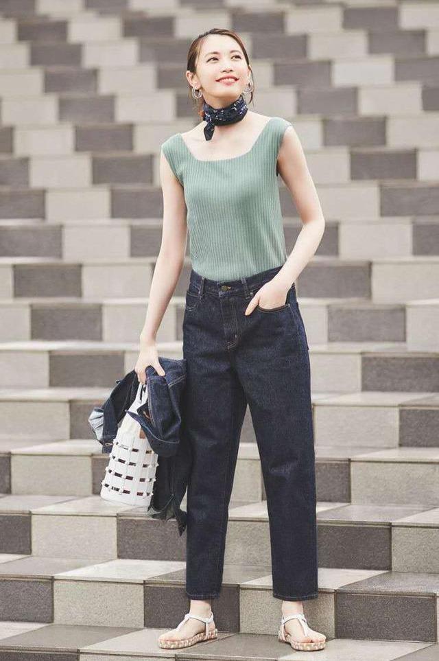 For example, use a silk scarf to embellish it method, but if you want to tie a silk scarf around your neck, you need to have a major premise, that is, the neck is long enough, you can use a small square silk scarf to divert your attention, and at the same time, the parts of the arms and shoulders are relatively close, and the focus is Everything is concentrated in this position, so it looks slimmer. And green is very in line with the summer atmosphere, using the combination of green and dark colors to create summer fashion.