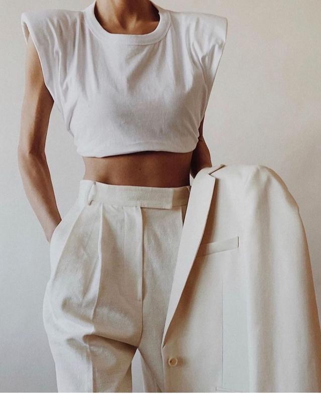 Short styles are particularly popular this year Clothes that reveal your slim waist are both cool and fashionable. You can also choose short sleeveless T-shirts with shoulder pads. This style is relatively unique and requires experience in dressing or a good figure. It can be completely matched with the effect. The lower body is matched with high-waisted pure white pants, using the same color to become more advanced.